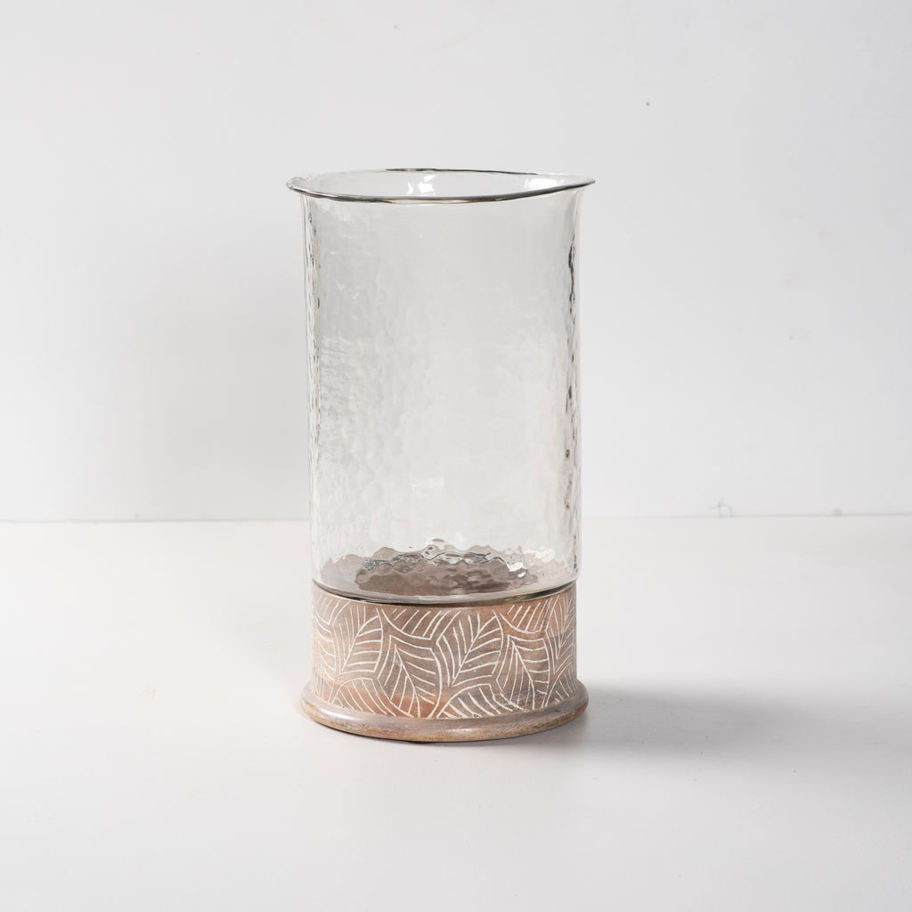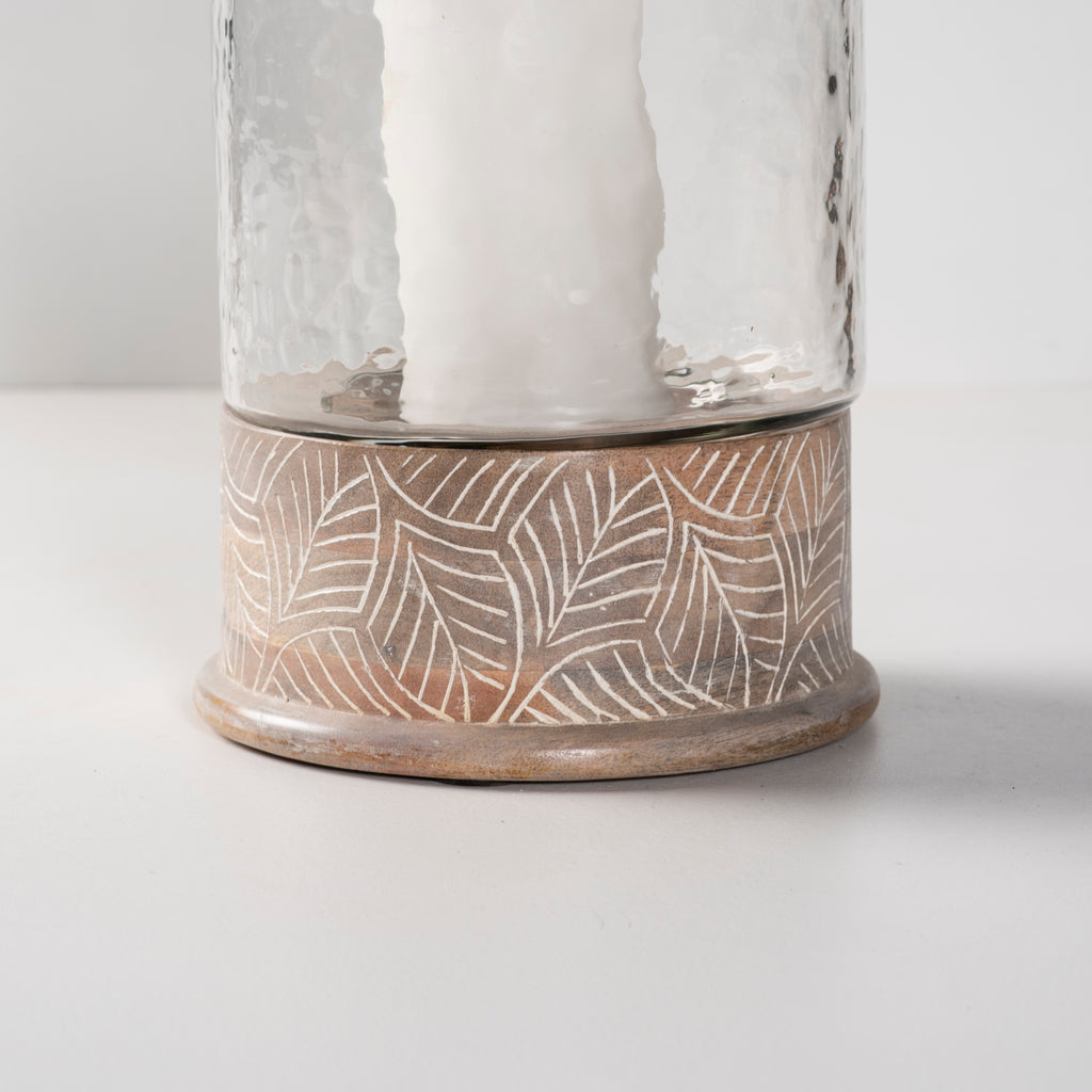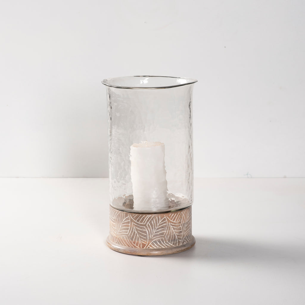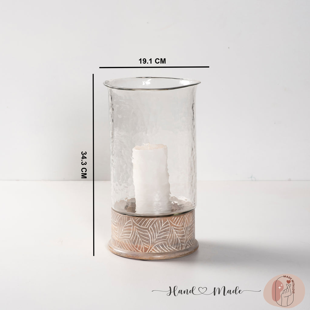 Illuminate your space with the Ivory Intricacy Embossed Handpainted Wooden & Glass Large Candle Holder