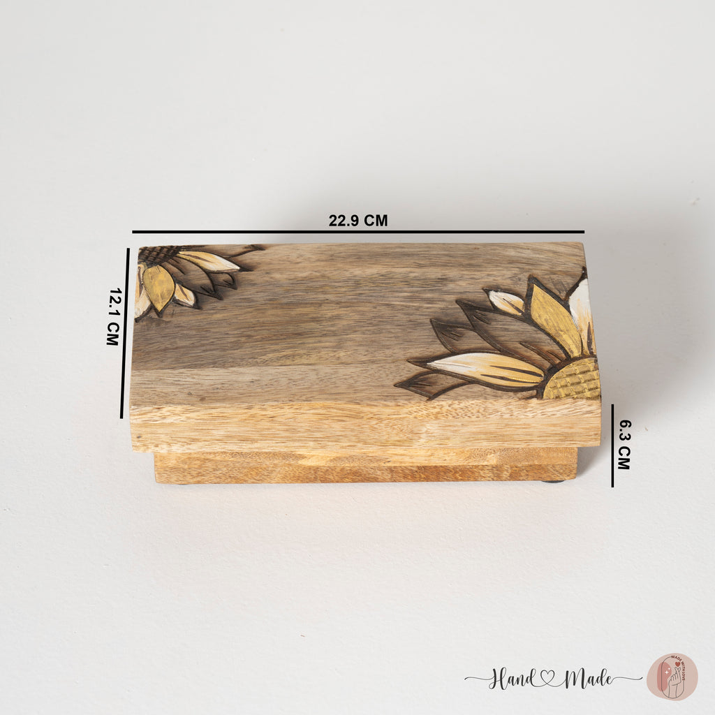 Step into an era of regality with the Sunflower Phyographed Burned Wood & Brass Leaf Inlay Storage Box, where functionality meets artistic elegance.