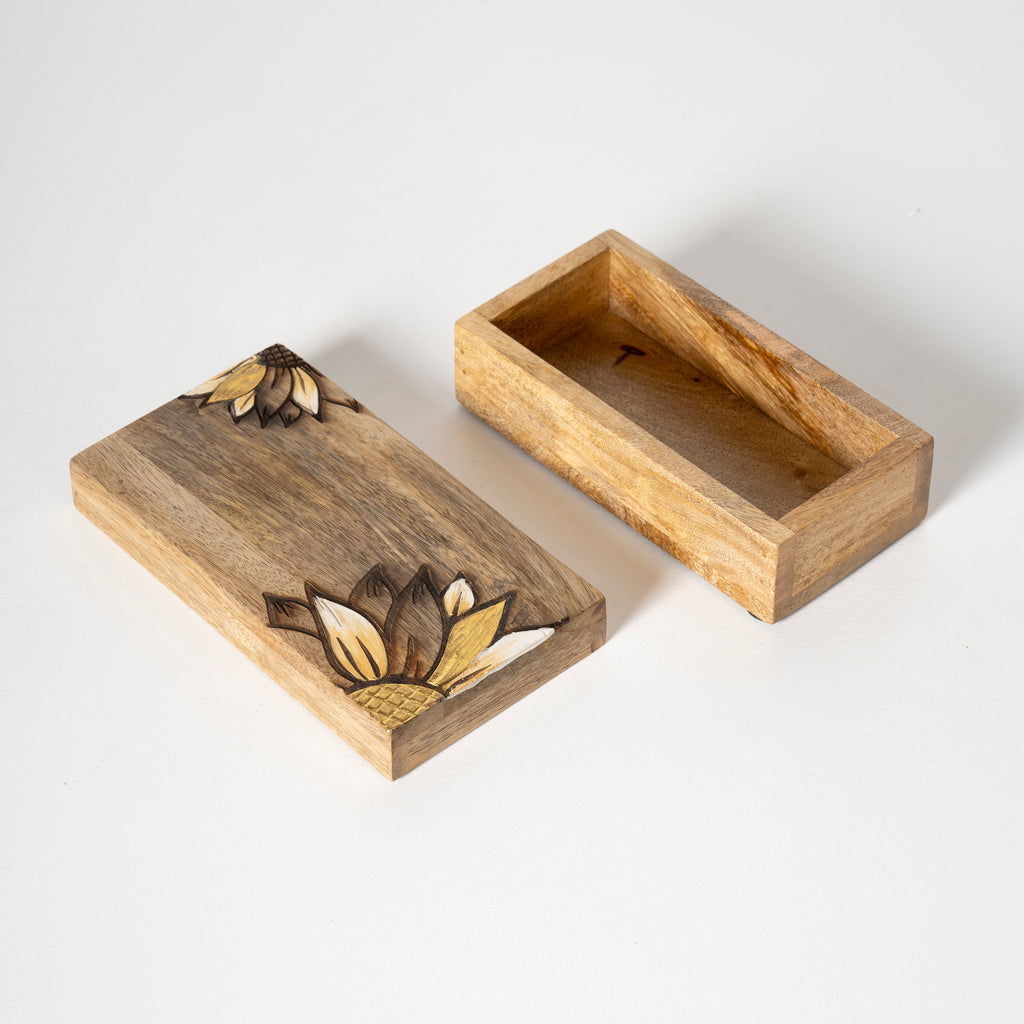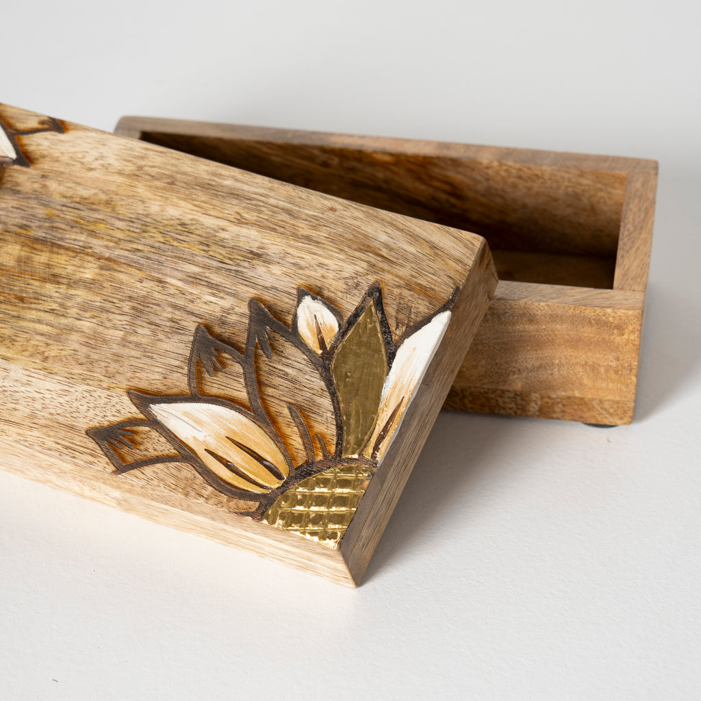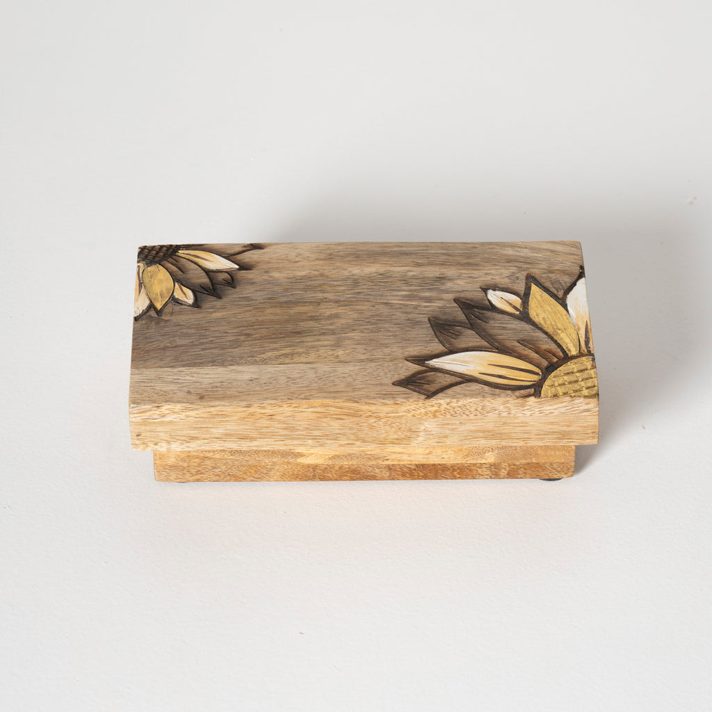 Sunflower Phyographed Burned Wood & Brass Leaf Inlay Storage Box