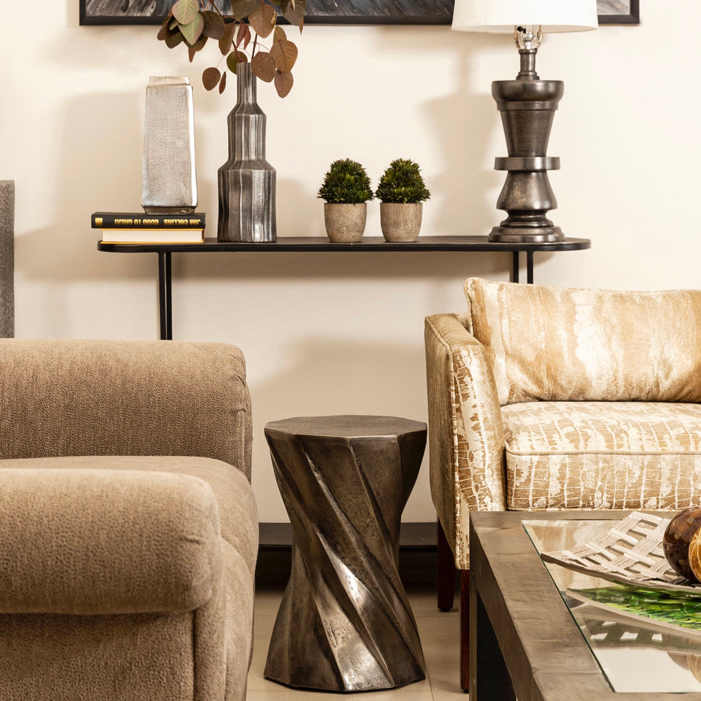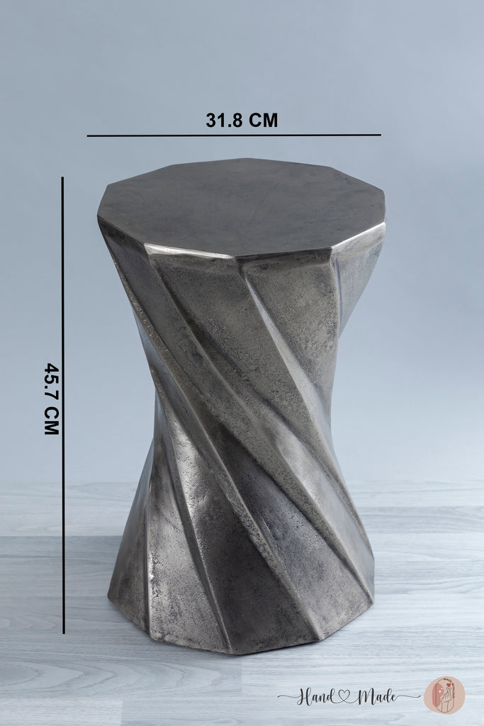 Elevate your living space with the Krato End Stool, a poetic marvel crafted with Casted Metal in a Nickel Antique Finish.