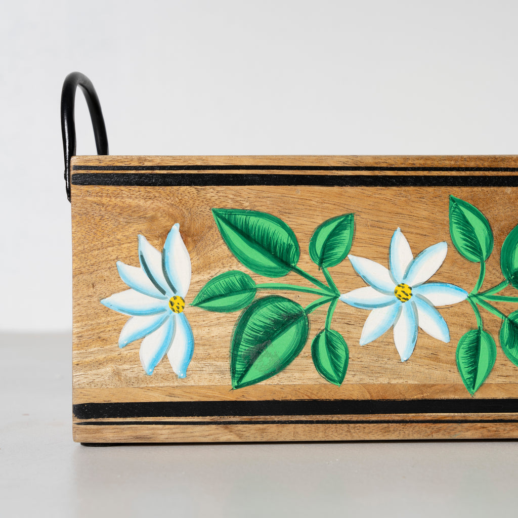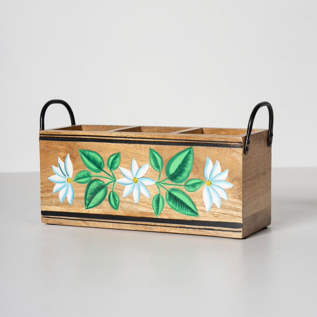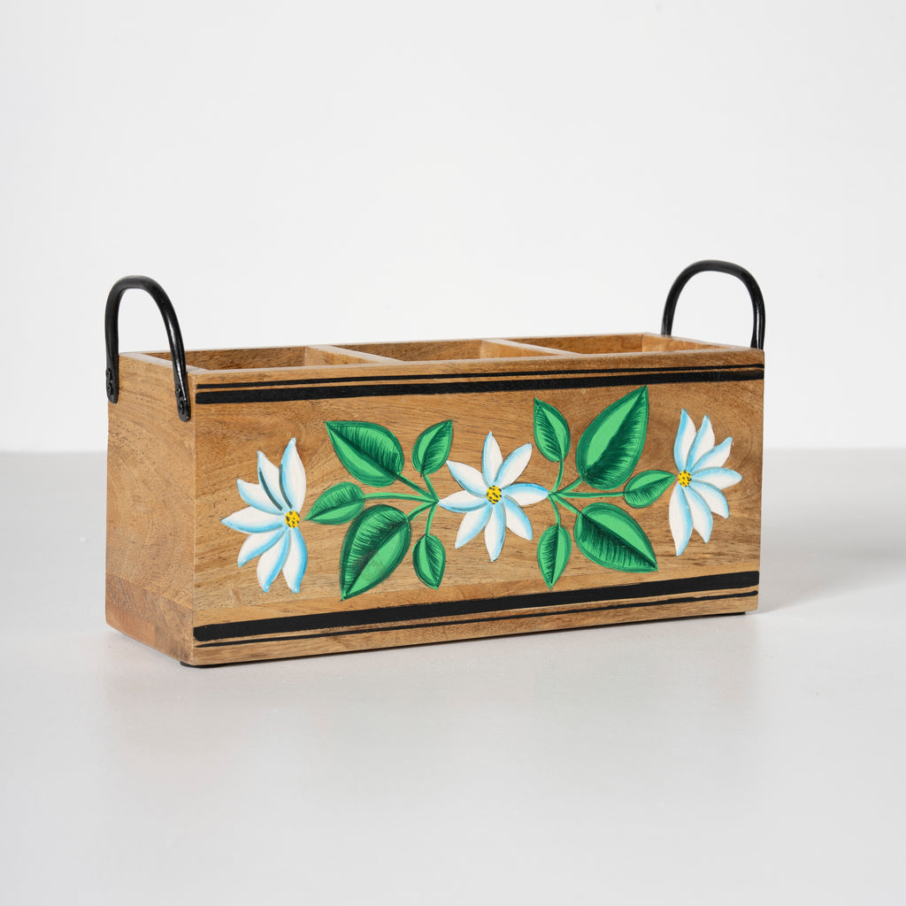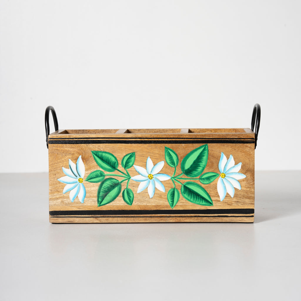 Crafted from Mango Wood and adorned with Meenakari Paint, this caddy is a versatile addition to your home decor. Use it to organize cutlery, napkins, or condiments during gatherings, turning functional items into botanical delights.